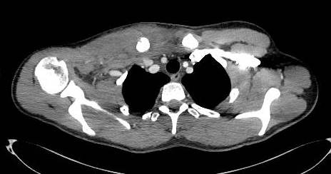 Fig. 2: Axial section from Contrast CT Scan showing compression of fracture on brachiocephalic vein