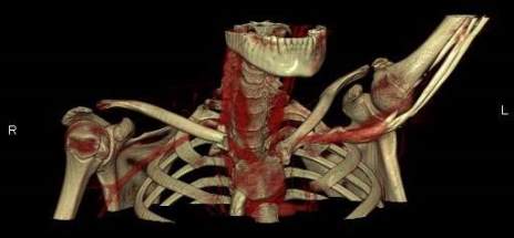 A Contrast CT with 3D CT reconstruction scan (Fig. 2, 3), confirmed the alignment of the floating fragment (rotated and with its medial end pointing posteriorly), which was causing compression on the right Brachiocephalic vein.