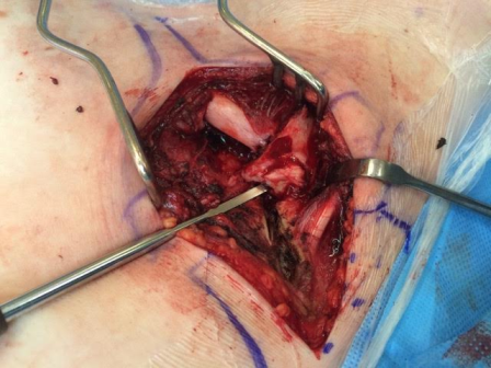 Fig. 4: Intra-operative image showing the rotated medial end of clavicle and disrupted sternoclavicular joint