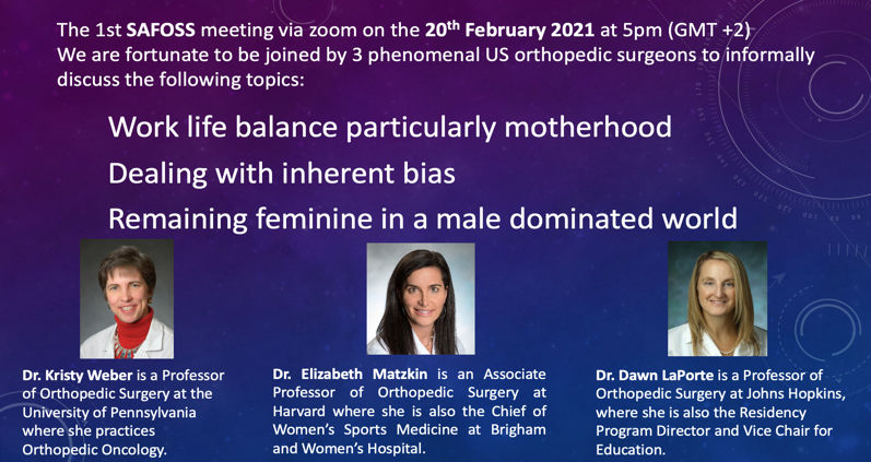 After returning to South Africa, I formed SAFOSS (the South African Female Orthopaedic Surgeons’ Society) at the end of 2020 to improve the numbers of women in Orthopaedics and support those already in the field. We currently have 71 members, comprising consultants, registrars, and medical officers.